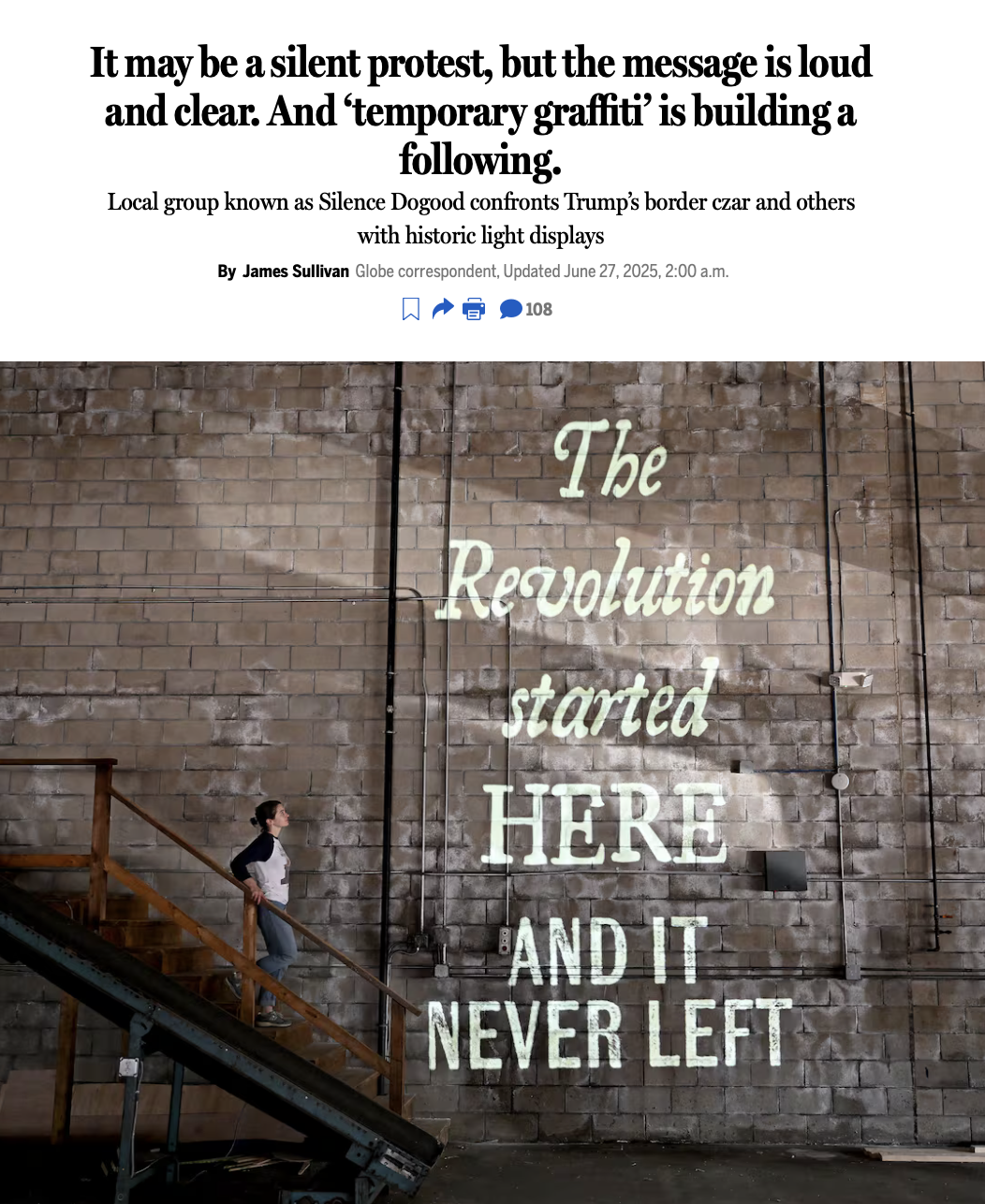2025 Best Guerrilla Art: Armed with high-powered projectors and Samuel Adams’s revolutionary spirit, the shadowy collective Silence Dogood has turned Boston’s most sacred landmarks into canvases for rallying resistance.