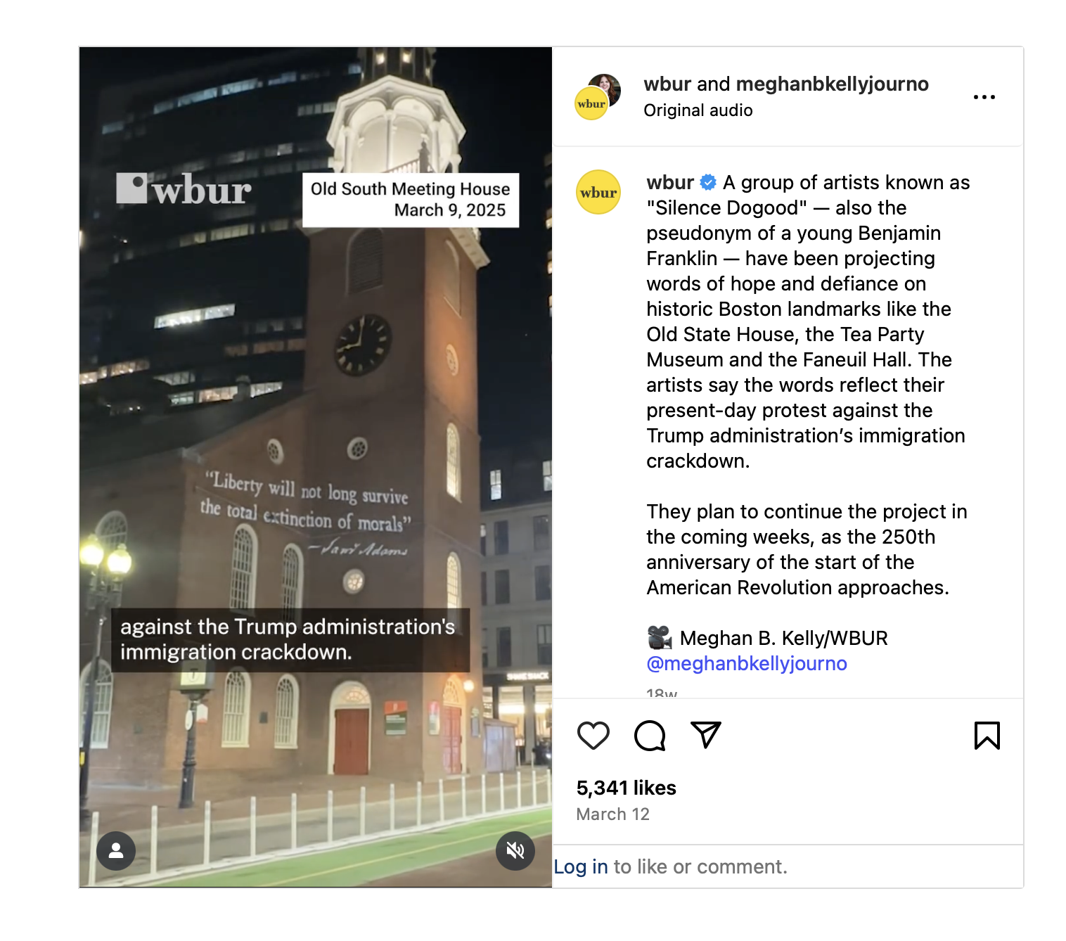 A group of artists known as "Silence Dogood" — also the pseudonym of a young Benjamin Franklin — have been projecting words of hope and defiance on historic Boston landmarks